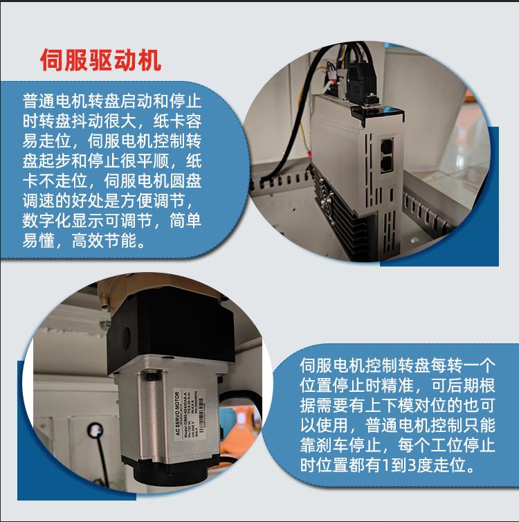 ②伺服電機(jī)控制轉(zhuǎn)盤,模具邊上可以放一疊紙卡,方便工人能快速放進(jìn)模具,大大提高生產(chǎn)效率。普通電機(jī)控制的轉(zhuǎn)盤,模具邊如果放紙卡就會把紙卡沖走轉(zhuǎn)位。
